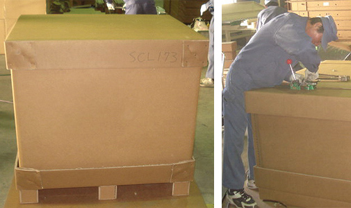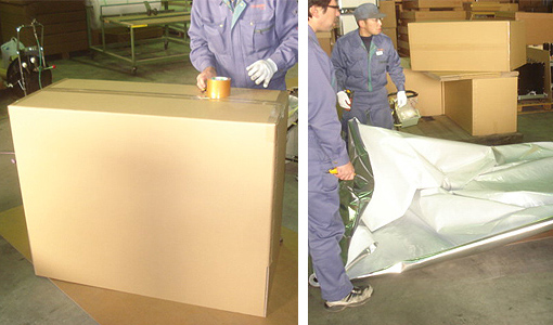 各製品をミラーマットで梱包し、箱に入れ、バリヤシートの上に並べます。